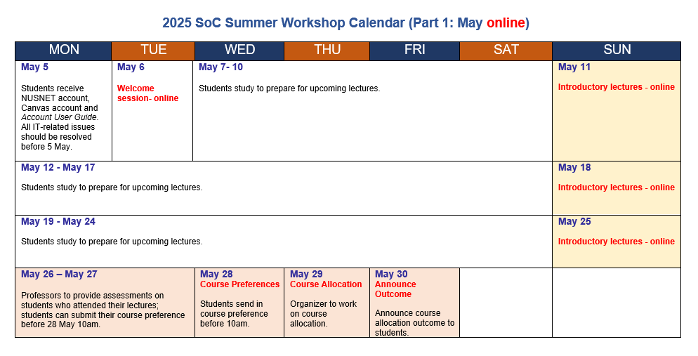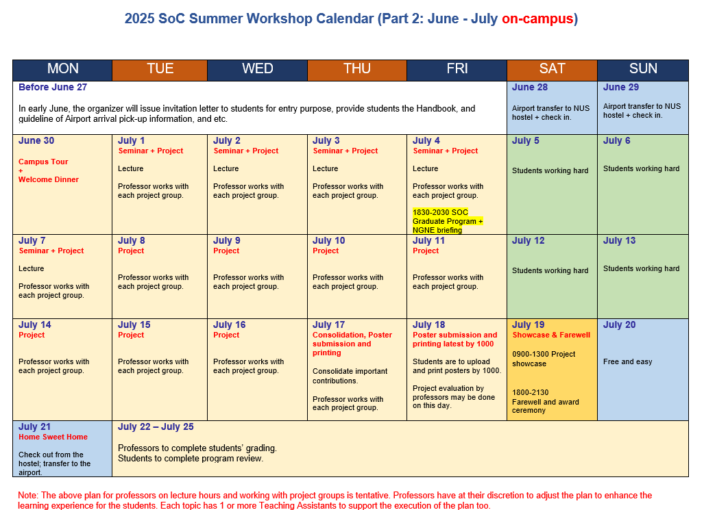 The National University of Singapore (NUS) School of Computing (SOC) Summer Workshop 2025 is the seventh edition of a workshop-based programme organized by NUS, School of Computing. NUS is ranked 1st in the Asia-Pacific region and 8th globally by QS World University Rankings 2025, and the School of Computing is ranked 6th globally by the QS World University Rankings by subject 2024.