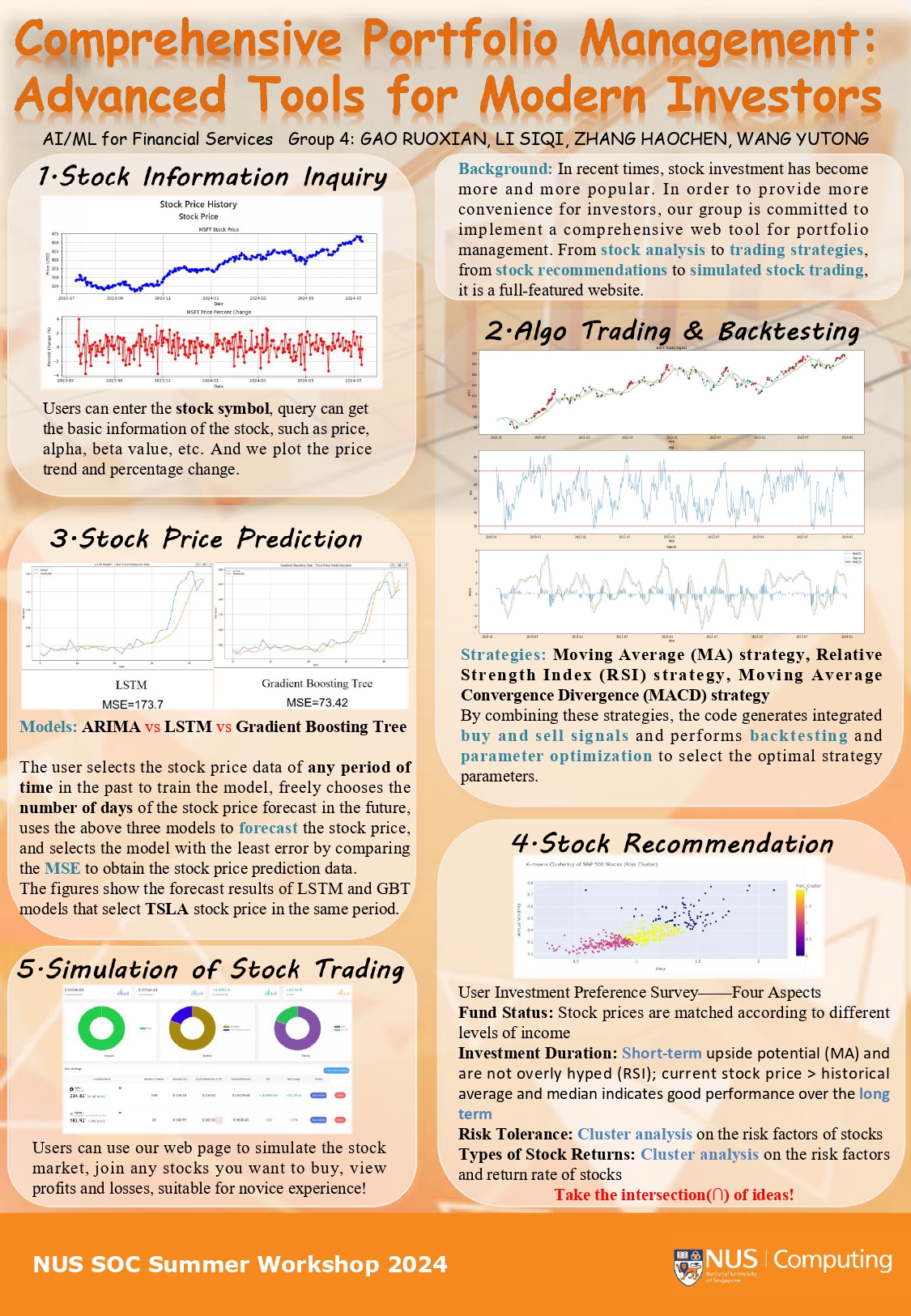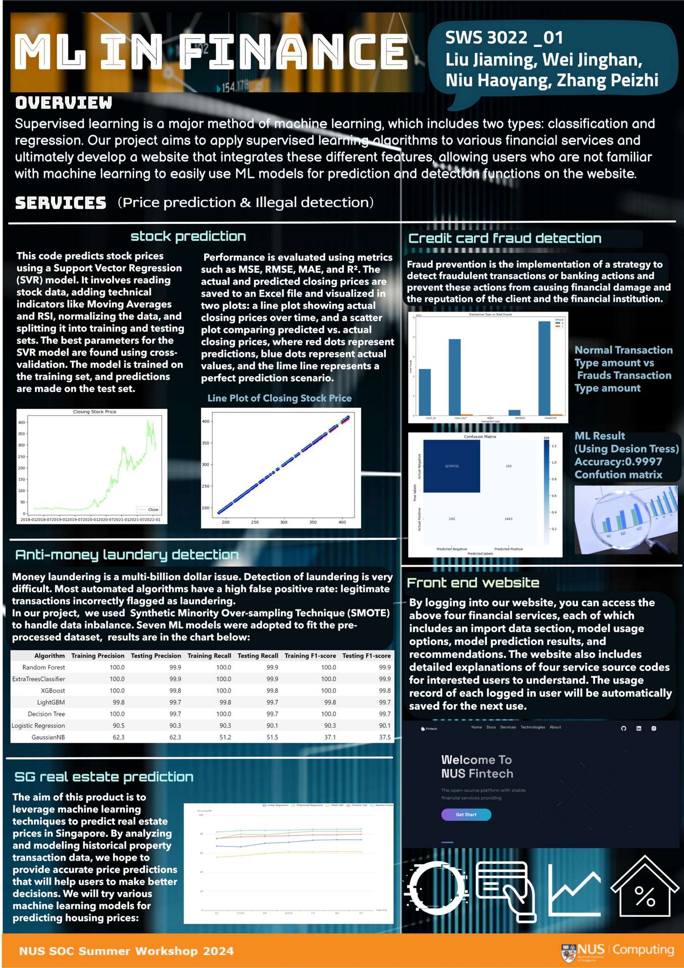 In this workshop, students will be introduced to financial services, trading and the importance of AI/ML in the fintech industry with a set of case studies. Students will learn fundamental concepts of AI/ML, including supervised/unsupervised learning, Naive Bayes Classifier, Logistic Regression, bias-variance tradeoff, principal component analysis,  Support Vector Machine, Decision Tree, Random Forest, K-Means, Agglomerative Approach,  ARIMA, GARCH, etc and Evaluation Metrics and neural networks (ANN, CNN, RNN, LSTM, NLP, LLM, etc).  You will get hands-on experience in obtaining financial data via Quandl, or Yahoo Finance and understanding financial data and structure the data in a way that is amenable to ML algorithms. Students will be equipped with skill to implement machine learning algorithms to extract key features from financial datasets. Students will also be trained to develop frontend dashboards with tools such as streamlit and dash; and to develop fintech web applications using modern web application frameworks such as reactJS, python-flask and basic DB. Students will also be introduced to the financial system for the future such as Finternet through case studies, research and group discussions to think about opportunities and applications in the future.